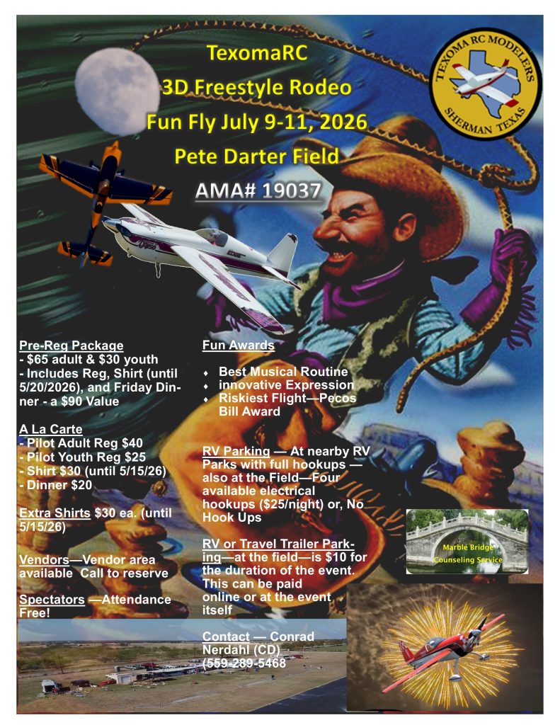 This invitation comes to you from the TexomaRC Modelers (AMA#0276), in Sherman Texas. The purpose is to invite you to attend our first annual TexomaRC 3D Freestyle Rodeo. The event is sanctioned by the Academy of Model Aeronautics (Sanction #19037) to be held July 10-11, 2026 (Fri-Sun).